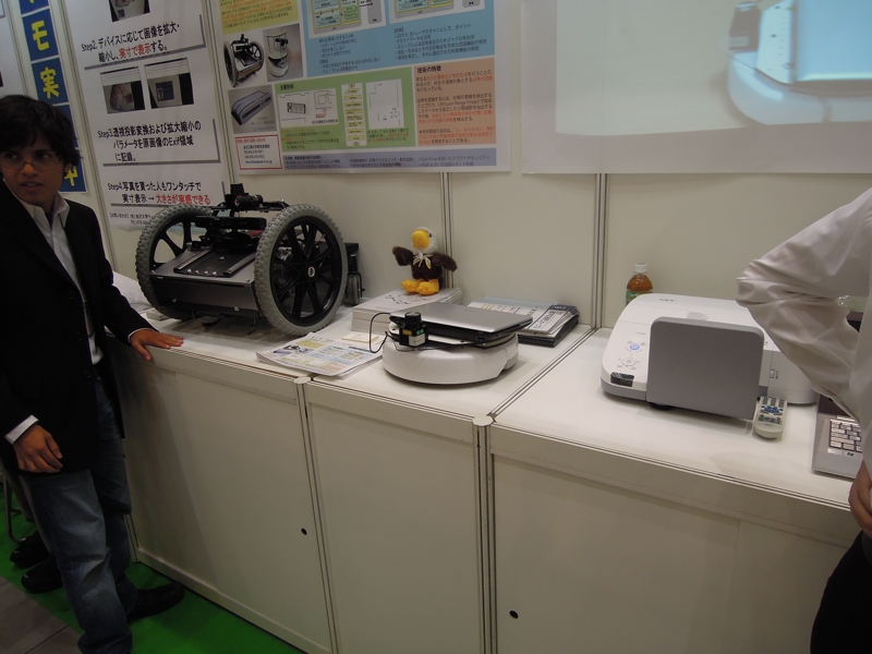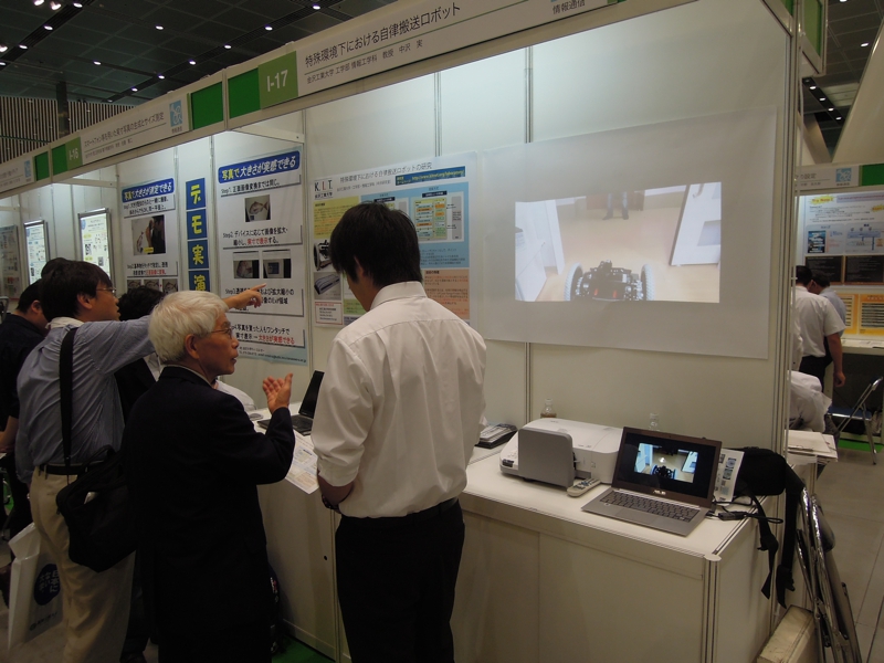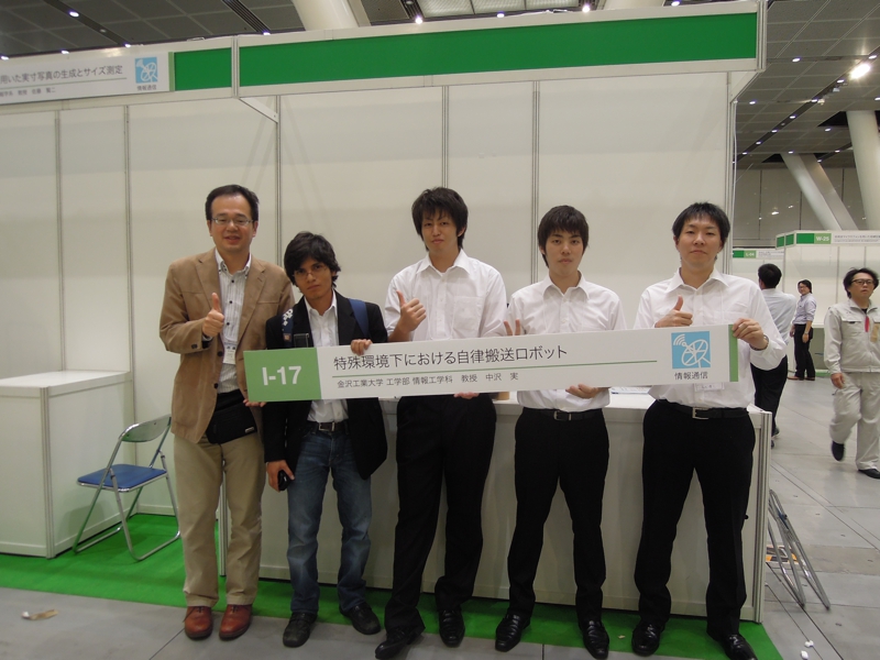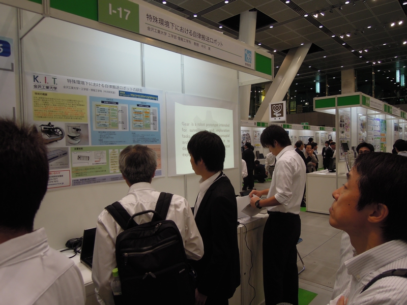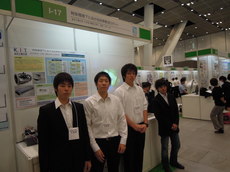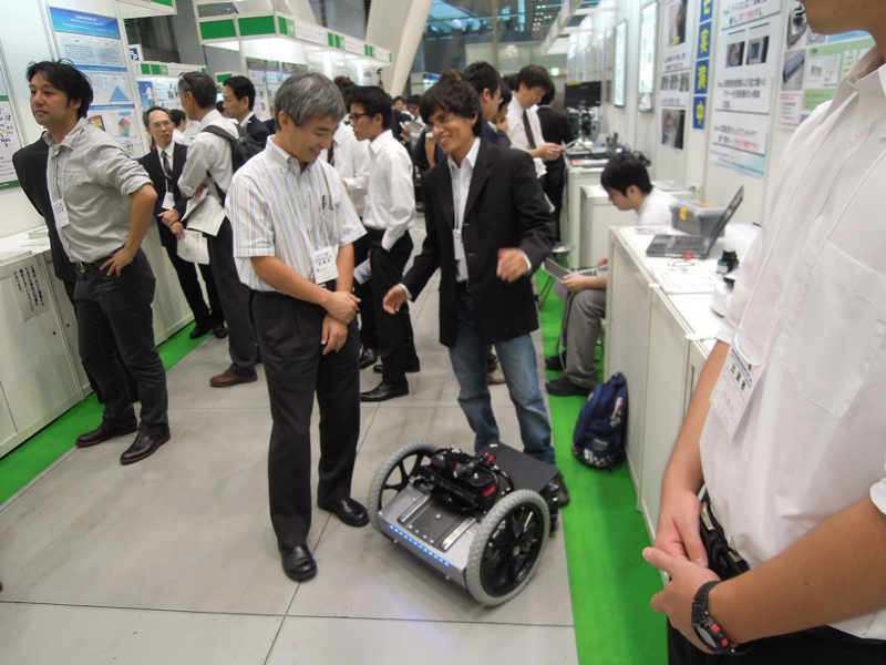 二日間に渡る今回の展示は,いつものことながらロボットのトラブルが生じてしまい直前どころか,開場してからも調整が続くといった大変な状況ではあった.しかしながら,場所的に東京国際フォーラムということもあり,近くに大型の家電販売店があったおかげで修理部品を調達できたのは不幸中の幸いではあった.また,研究生4名(稲生君,鹿田君,平谷君.マルコ君)の展示に対して熱意を持って対応して頂いたおかげで周囲からの印象も良かったのではないかと思います.